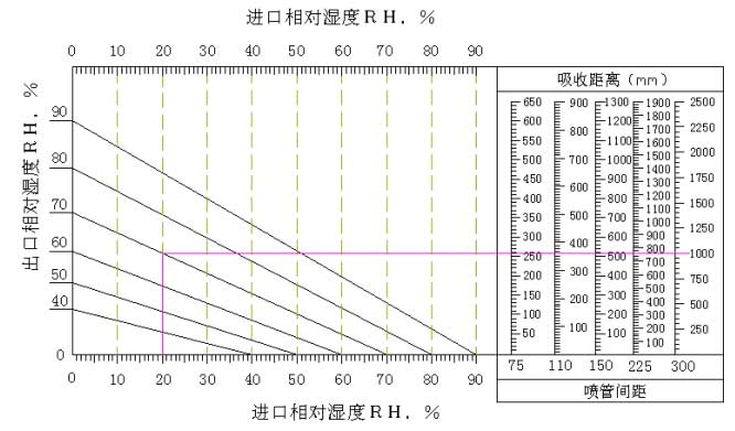 工况条件:风量为36000m3/h (全新风);表冷器面积为2m×2m=4㎡;新风状态为温度5℃,相对湿度50%RH,空气经加热后的温度为14℃,相对湿度30%RH,要求加湿后为温度14℃,相对湿度为90%RH;加湿段小于1000mm。