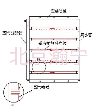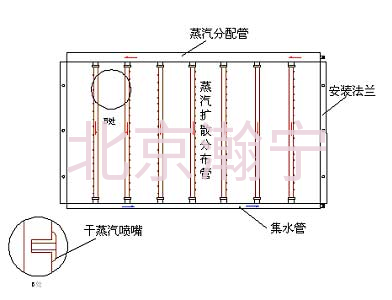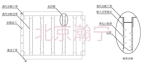 3、蒸汽分布均匀:设备采用若干蒸汽分布管均匀分布配以高密度干蒸汽喷嘴,使得蒸汽能够最大限度的与空气充分接触、混合。