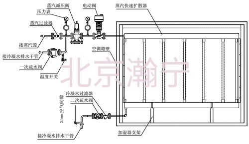 RKS系列蒸汽快速扩散器是由蒸汽分配器、集水管、若干蒸汽扩散分布管、高密度干蒸汽喷嘴等结构组合而成,其原理是蒸汽通过主管路均匀分散进入蒸汽分布 管,再由高密度干蒸汽喷嘴喷出进行空气加湿,整个过程所产生的冷凝水汇集到另一主管路经冷凝水管排出。由此完成了空气加湿的目的。
