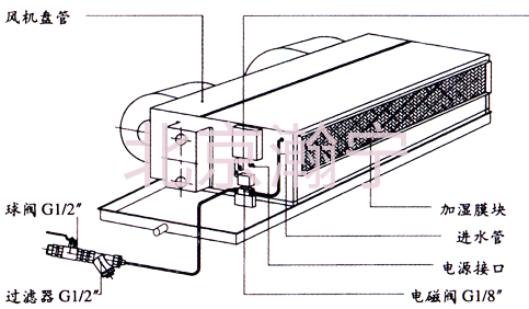FPSM风机盘管专用加湿器的工作原理是将经过盘管加热后的空气通过湿润的 特殊湿膜,湿膜上的水气化到空气中,从而使空气得到加湿。当室内湿度达到用户要求值时,室内恒温恒湿控制器自动输出一个电信号给加湿器,让加湿器停止工 作!需要强调的是,FPSM风机盘管专用加湿器的主机及电磁阀、过滤器等全部安装在风机盘管机器内,设计院设计时只需在原风机盘管设计的基础上,增加一路上水自来水管路即可 (通径DN15),电器接线可与普通盘管风机盘管一样!