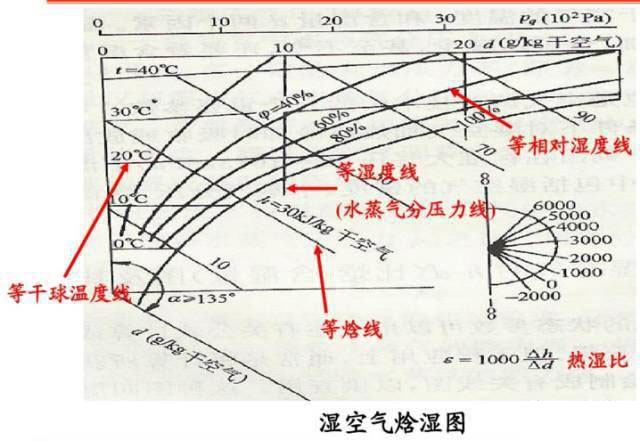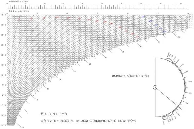 以比焓h-纵坐标,以含湿量d-横坐标,表示大气压B一定时湿空气各个参数之间的关系;包含五种线群: