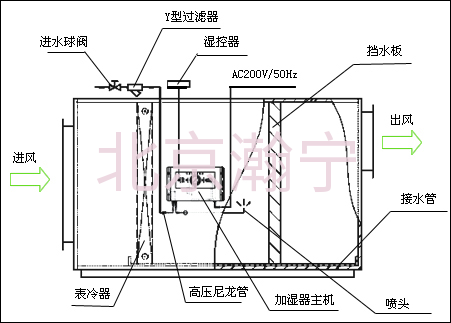 高压喷雾加湿器是将加湿器主机安装在空调机组的侧面板上,喷雾系统(喷头、喷杆)等装在空调机组加湿段内部的一种等焓加湿方式。这种加湿方式是将自来水经加湿器主机增压后,通过特制的喷头雾化高速喷出形成细小的水雾粒子,与流动的空气进行热湿交换,吸收空气中的热量(或显热),汽化、蒸发,使空气的湿度增加,实现对空气的加湿处理。